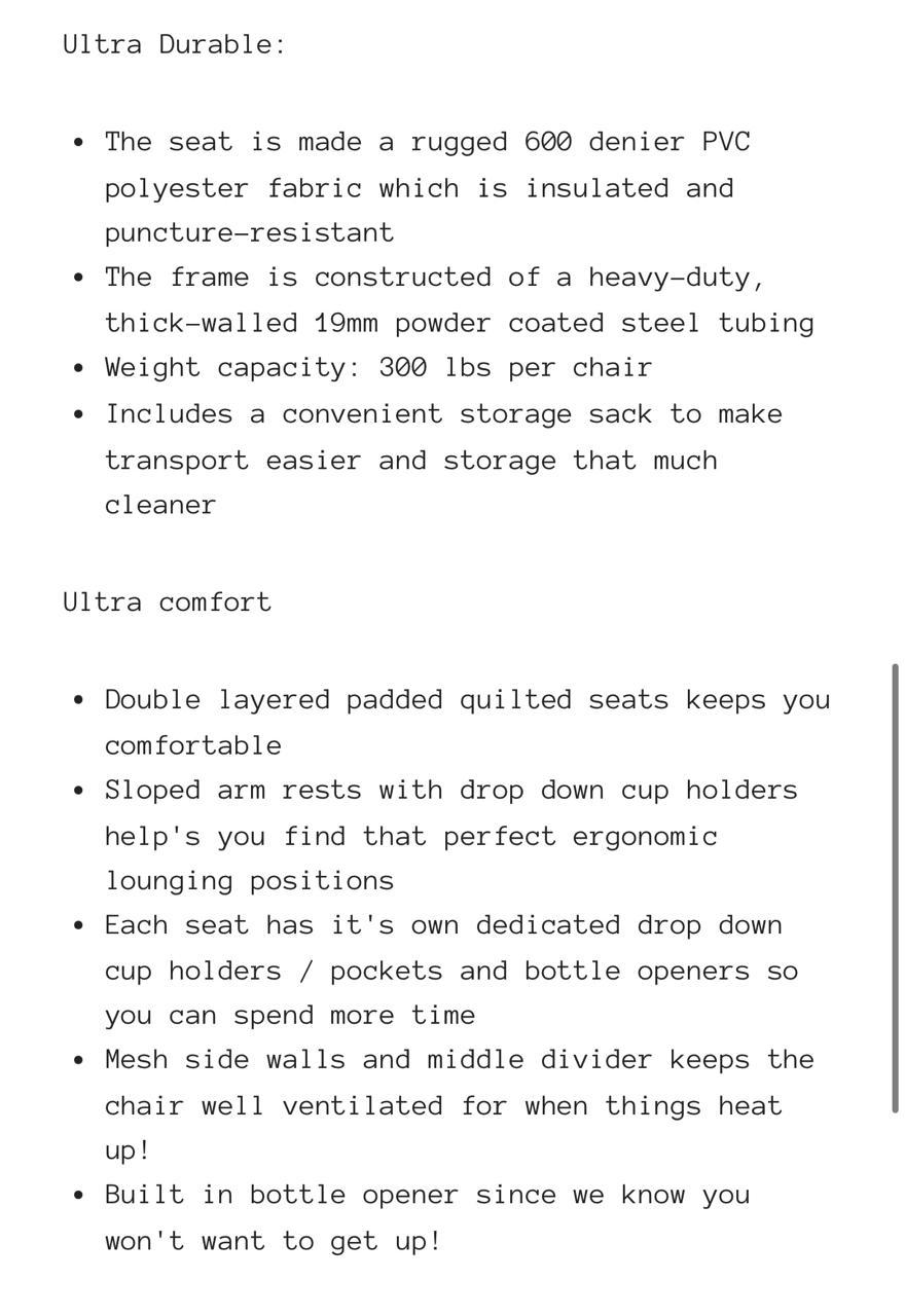 Enjoy comfort for two wherever your adventure takes you. This foldable double camping chair is designed for outdoor lovers who enjoy relaxing side by side. It features a strong steel frame, padded seats for extra comfort, and breathable mesh panels to keep you cool. Perfect for camping, picnics, fishing, beach trips, and backyard gatherings.